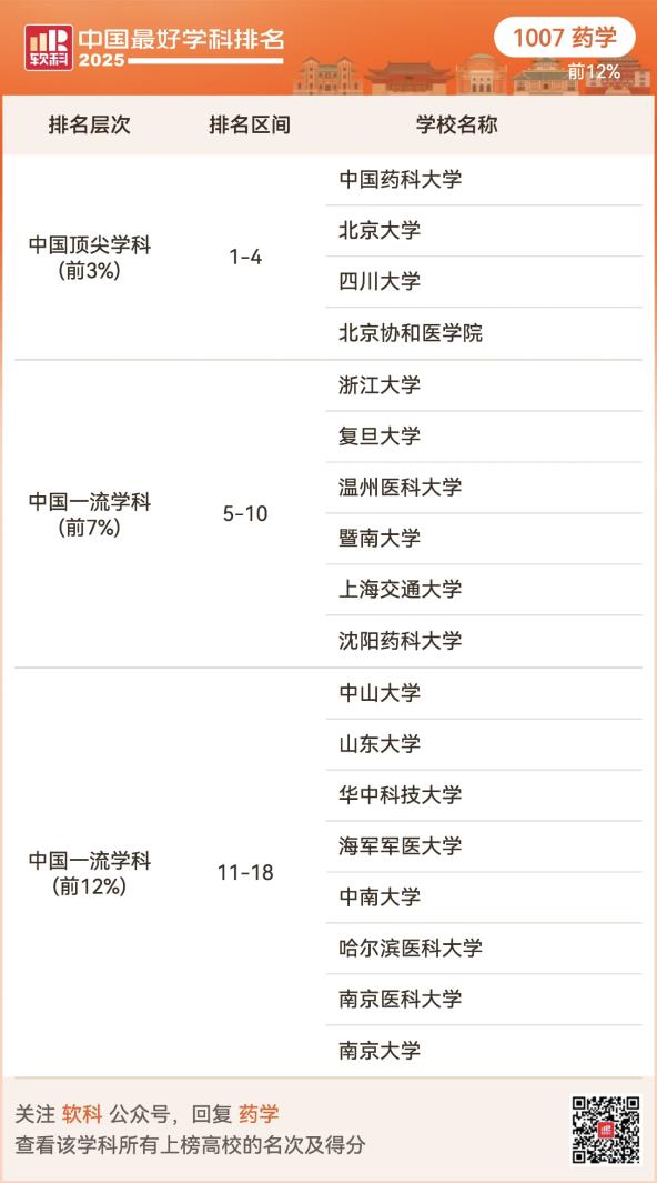 2025年10月15日,软科正式发布“2025软科中国最好学科排名”,四川大学药学学科位列全国第三,已连续四年入选中国顶尖学科。