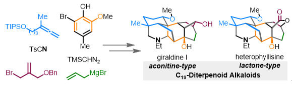 二萜生物碱是乌头属和翠雀属药用植物中的主要活性成分,具有抗炎、镇痛、抗心律失常和抗肿瘤等多种药理活性。Giraldine I属于典型的乌头碱型C19-二萜生物碱,而heterophyllisine则属于结构独特的内酯型C19-二萜生物碱。两者均具有多环笼状骨架与多个手性中心,复杂的分子结构使其合成工作长期面临挑战。